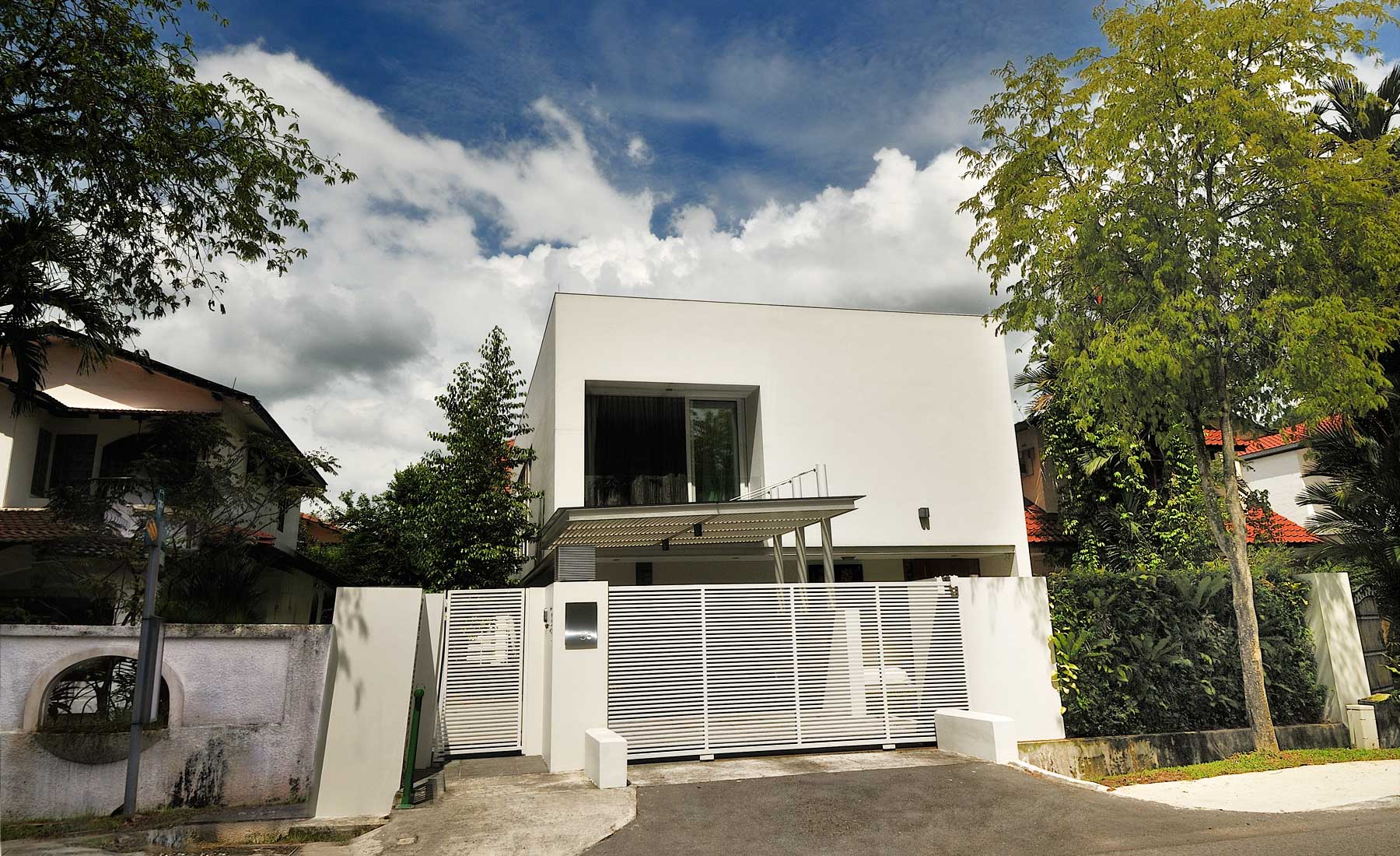 Simple cladding technique shields the western sun from heating up the interior and with the void at the dining and skylight above the stairs, it allows hot air to be dissipated through the louvers.